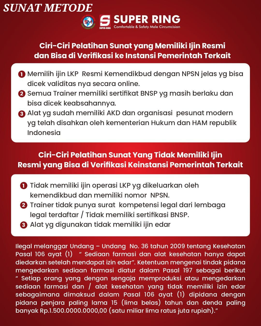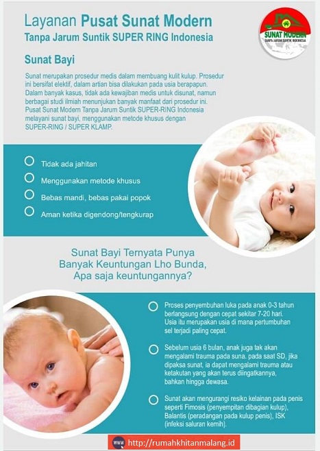 Sunat Metode Super Ring ini diklaim tanpa harus kontrol ke dokter dan 8 hari pasca sunat ring yang berada di alat kelamin si anak yang disunat akan lepas dengan sendirinya. rumahkhitanmalang.id